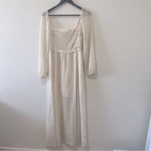 Features: Eyelet fabrication, embroidered detail at bust, square neckline, semi-sheer sleeves with elasticated cuffs, low open-back with smocked band, lined
