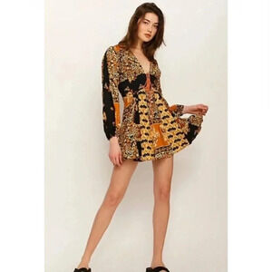 NWT Free People Mixin' It Up Mini Dress Long Sleeve Babydoll Printed V Tunic
