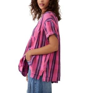 Cheerful plaid covers this flowy cotton tunic top popped with a patch pocket at the chest.