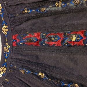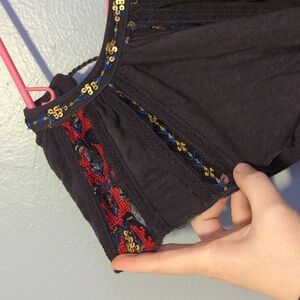 Selling new with tags Free People Morocco Tank Top in washed black color. This boho style tank top has so many cute embellishments there's a mesh insert along the hem and down the middle with intricate beading and sequins in a stripe pattern along a sun ray pattern and a toe neckline on the back complete with detailed tonal blue tassels. This is great to pair with jeans for a casual look or pair with a skirt for a breezy more put together look and vibe. In good condition with no holes or stains. Offers are considered. Bundle 3 to save 30% in my closet.