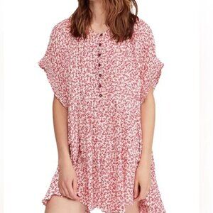 NWT Free People mini dress in red floral print. Size L. Runs oversized, drawstring at waist can be cinched. Button closure at top with short dolman sleeves