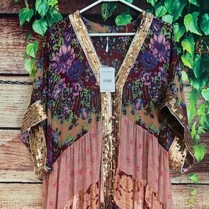 Free People One Fine Day Maxi Duster Large Sheer Sequin Tiered Floral Dress NWT