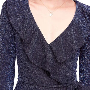 Celebrate and dance so free in this ruffle-trimmed wrap dress alight in metallic shimmer.