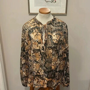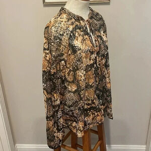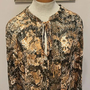 Perfectly printed in a sheer fabrication, this timeless blouse is featured in a drapey, oversized silhouette with tie detail at neckline for added versatility.