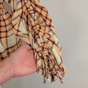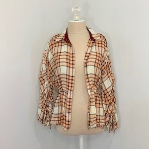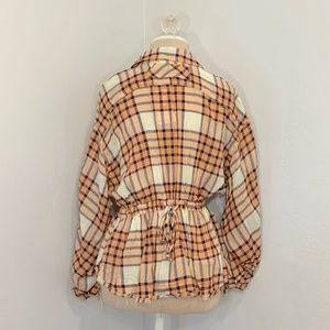 Brand new with tags. A flattering cinched waist and classic plaid make this top a unique wardrobe staple for fall.