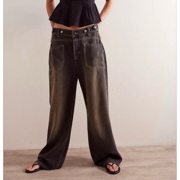 New with tags Free People We The Free “Palmer” mid-rise cuffed jeans with a baggy wide leg style in a washed black carbon color, size 24 in rigid non-stretch denim.