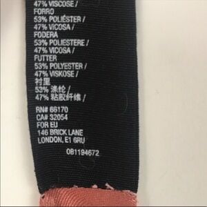 100% Polyester. Lining: 53% Polyester, 47% Viscose.