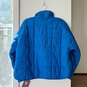 New with tags Free People FP Movement "Pippa" packable puffer jacket in mid blue with white zipper detail, size extra small lightweight, water-resistant