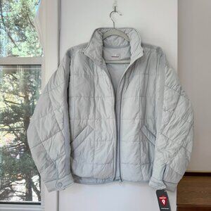 New with tags Free People FP Movement "Pippa" packable puffer jacket in light blue with black zipper detail, size small lightweight, water-resistant