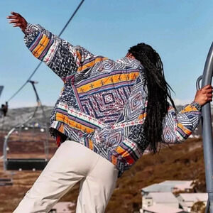 winter, print, unique, ski, skiing, snow, puffer coat, zip up, puffy, duvet, hip, crop, cropped, quilt, pippa, scout, quilted, winter, fall, warm, down, fp movement, colorful, geo, aztec,