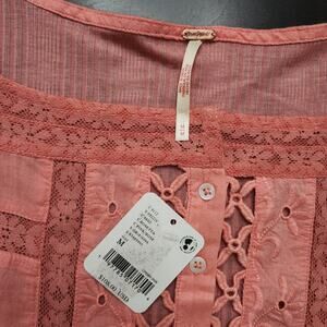 New with tags Free People Pretty Please Lace Tunic Top in Rosetta Pink. Flowy design with open lace button bodice.