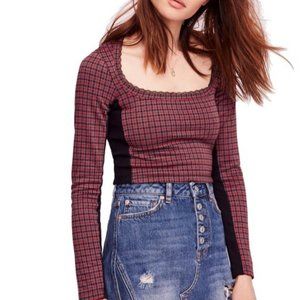 Perfect red plaid print cropped Free People top to pair with high-rise jeans or shorts
