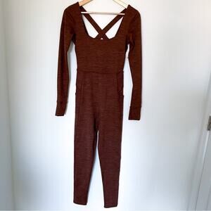 Long sleeve FP movement jumpsuit, thumb holes, side pockets, cross strap back, super soft and stretchy fabric