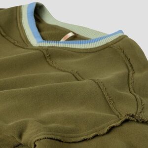 Features: Soft cotton fabrication, contrast ribbed hems, V-neckline, drop-shoulder sleeves with cuffs, exposed seaming throughout