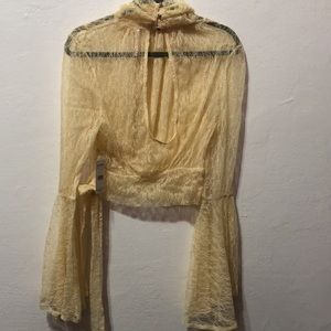 New With Tags Free People Rule Breaker Lace Top Color: Tea (Beige) Whimsical lace and flowy long sleeves bring a touch of boho flair to a romantic top that will take you from work meetings to date night with elegant ease. Unlined and sheer Mock turtleneck Long flounce sleeves Banded hem with self tie on side Back keyhole with buttons.
