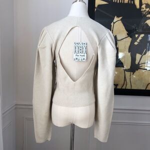 Turn heads coming or going in this shaker-knit sweater with puffed, pleated sleeves that frame the square neckline in front and a daring open cutout in back.