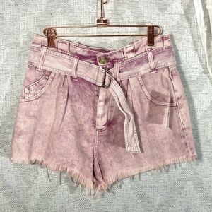 tag: high waisted, paperbag waist, distressed hem, barbie core, pink shorts, free people