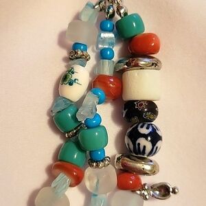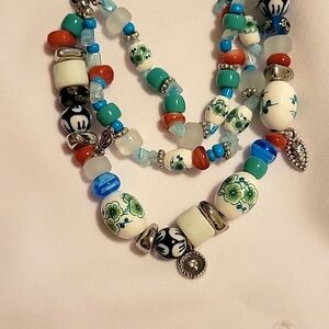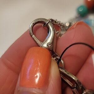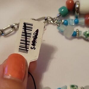 Gorgeous choker with beautiful painted beads. The colors are green, blue, amber and a pop of white with silver chain. Lobster clasp with little diamond detail. Japanese inspired. By Free People NWT.
