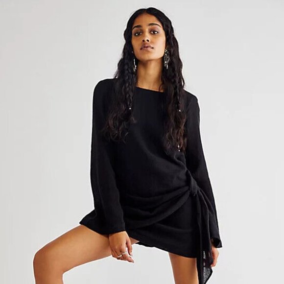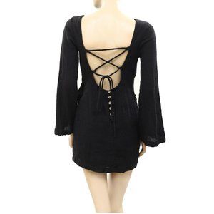 NWT Free People Simona Black Long Sleeve Mini Dress Lace Up Buttoned Low Cut