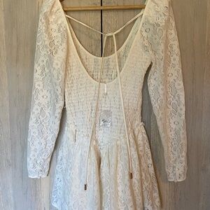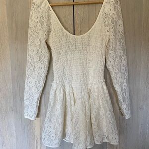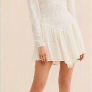 Details: scoop neck, smocked bodice, floral lace, semi sheer sleeves, skirt is ruffled and lined, light stretch, fit & flare, mini. Material: Polyester Blend