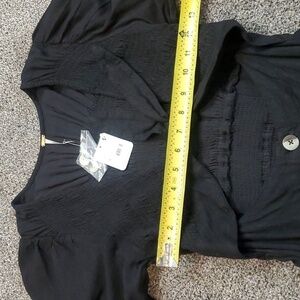 Puffed elbow length sleeves with shirred cuffs.