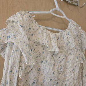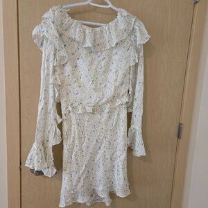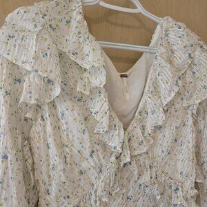 Brand new Mini dress by Free People. Ivory with blue floral pattern. V-neck and long sleeves. Lined on the inside. Textured exterior with ruffles along the neckline.
