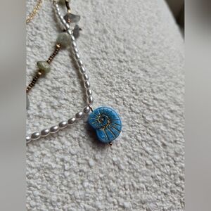 So beachy and boho, this layered necklace features mixed-material chains and stone and shell charms.