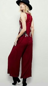 Ultra flattering and intricately detailed romper, futuring plunging neckline and contrast embroidered detailing along the bust. Soft mesh back with button closures and wide leg silhouette. Incredibly attractive and comfortable! Runs true to size. Bust:28.0", Waist:30.5", Hips:41.0", Rise:14.0", Inseam:28.0". New in a package,never worn