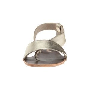 Crackled metallic Free People sandals with a wide, asymmetrical strap. Elastic gore inset. Leather sole.