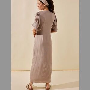 Button-front design, knotted bust detail, subtle puffed sleeves, ruching throughout
