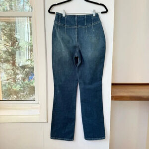 Features: Exposed button fly closure, corset-inspired yoking at the front for added shape, vented detailing at the hemlines, soft stretch denim