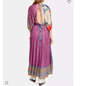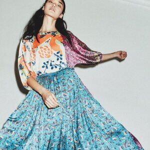 print maxi dress, styled with blouson sleeves and pleated skirt