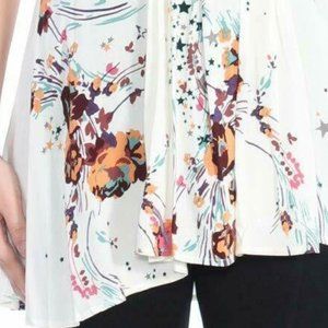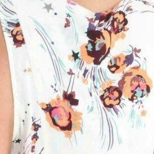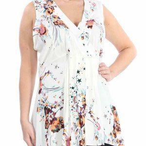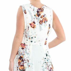 Garden floral galaxy stars pattern, sleeveless, v-neck, full wrap, pleated, flare, peplum, lightweight soft 100% rayon, tunic shirt. Ivory white, rustic orange, pastel blue, pink, green, teal, purple, brown.