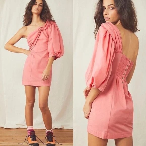 NWT Free People Women Looking My Best One Shoulder Puff Sleeve Mini Dress M Pink