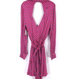 An allover geo print inspires retro charm on this swingy mini styled with a gaping neckline cutout. V-neck Long sleeves Partially lined 97% viscose, 3% elastane Dry clean or machine wash, dry flat Imported.