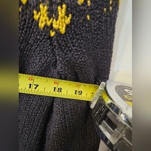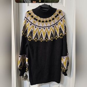 Stylish black sweater dress with a vibrant yellow geometric pattern. Perfect for a cozy and chic look.