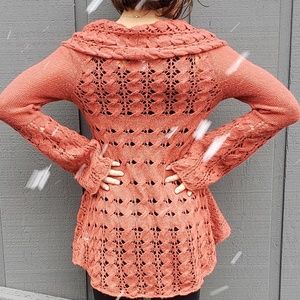 BRAND NEW Never Worn with tags. This adorable knit/crocheted sweater is sure to add a feminine touch to any style. You can dress it up or wear it casually as a light summery throw over with the warmth of 40% wool. The material is soft and flowy with beautiful designs. Model is 5'8" 130 lbs.
