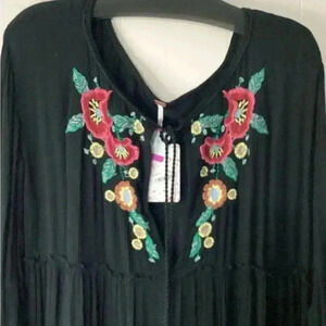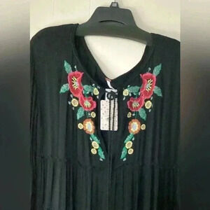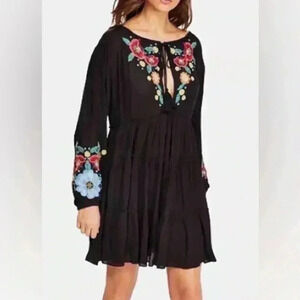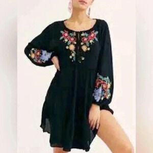 The floral embroidery on this gorgeous Free People swing dress is the perfect touch to this little black dress. Perfect for Fall paired with booties. Tie neck. Slip dress attached for lining. Long sleeve with elastic wrist