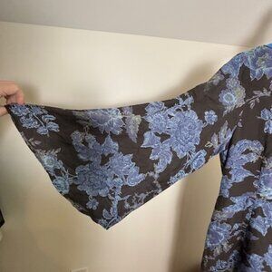 This dress is a lovely long sleeved floral dress from Free People, new with tags, in a size 8. The fabric is navy blue background with lighter blue flowers and gold accents on the flowers. It is 50/50 cotton/rayon with a rayon lining, and flows beautifully. The back of the dress has a summery criss-cross pattern, and there is a side zipper for fit. The long sleeves are belled. Bust is approximately 37 inches; waist 29 inches; hips 31 inches. The dress has an A-line from the waist. Neck to hem is 51 inches.