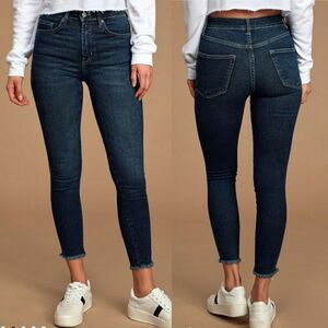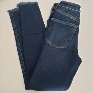The Free People Raw Dark Wash High-Rise Jegging are a total wardrobe staple for us! Super stretchy denim (in Free People's Deep Indigo wash) shapes these cute jeans that feature a high-waisted fit, belt loops, and five pocket cut. Slim flit, skinny pant legs end in cropped and frayed, raw hems. Branded top button and hidden zip-fly.