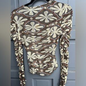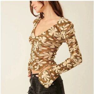 NWT Free People the Meadow ruched mesh long sleeve top, XS dried basil combo