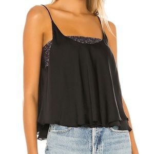 Svelte spaghetti straps adjust at the shoulders of a slinky satin camisole with a sequin-embellished panel that pops at the neckline, arms and back