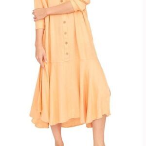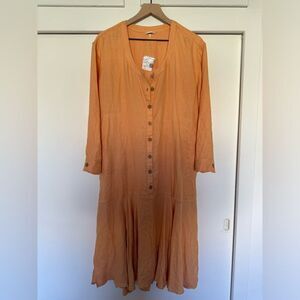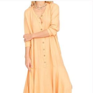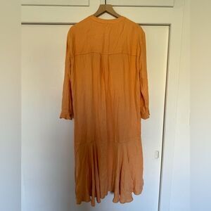 The Details: Soft peach henley dress with patch front pocked and a dropped ruffle hem from Free People.