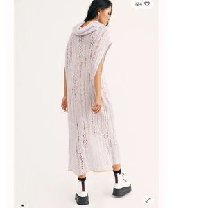 Super soft open-weave vest-style sweater featuring a cowl neck in a sleeveless maxi silhouette.