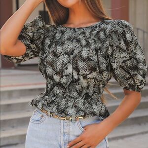 Femme with a touch of fierce, this top is sure to be your new go-to featuring puff sleeves and smocking throughout with ruffled bottom hem for added shape.