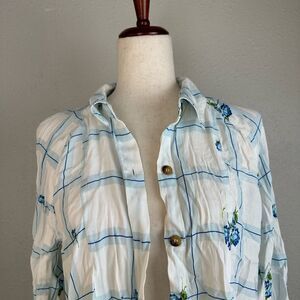 super cute blue button up! measures 21 inches armpit to armpit and 24 inches shoulder to hem