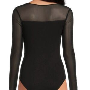 bodysuit featuring sheer mesh long sleeves and a sheer upper chest/back panel for a modern, elegant look. Soft, stretchy fabric for a flattering fit, perfect for layering or wearing alone for a night out.