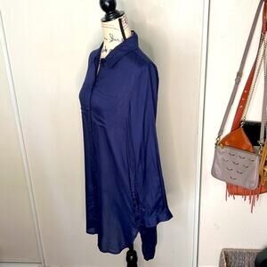 Lovely French Connection Blue Button-down Tunic Top features button-down front with collar, tunic length with side slits, breast and side pockets, 100% viscose.