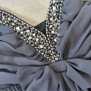 Featuring an embellished trim at V-neckline and straight back, thin spaghetti straps, ruched bust with bow detail, a zip and hook fastening at back and a wire-trim floaty hem.