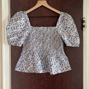 NWT. French Connection floral peplum top, with scrunching along the chest. Puffy sleeves. Square neck. Women's medium.